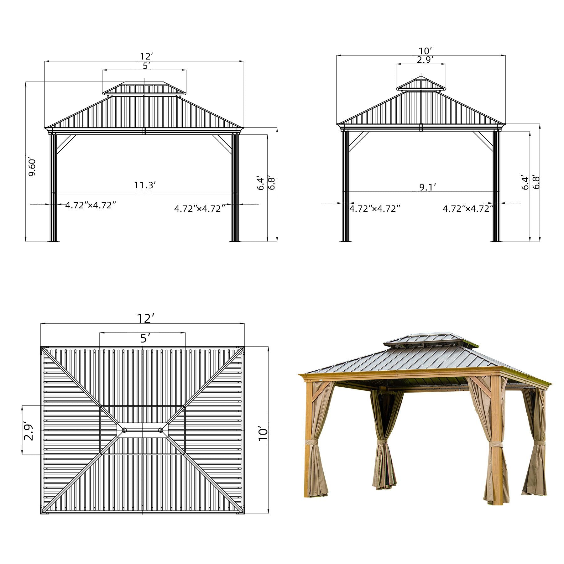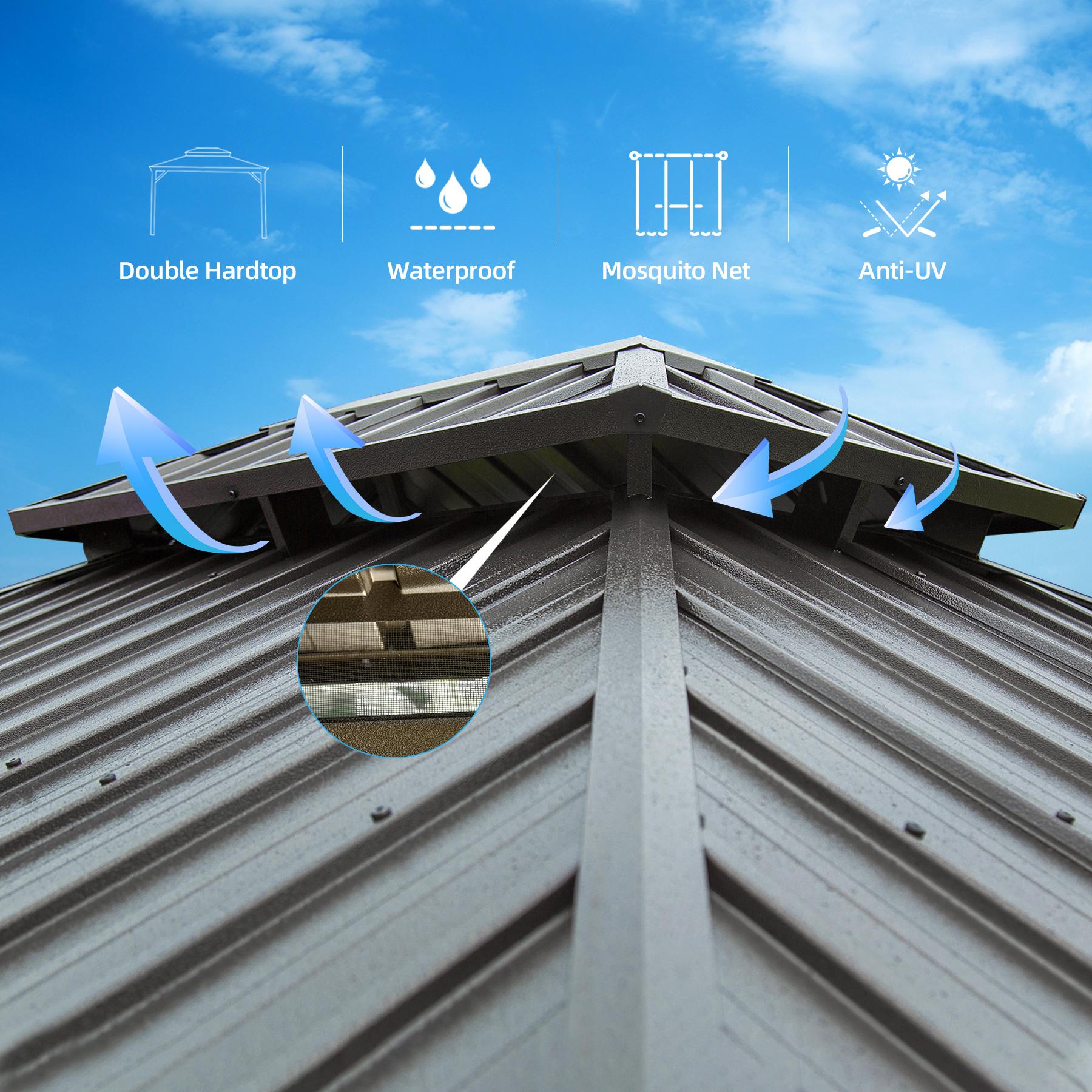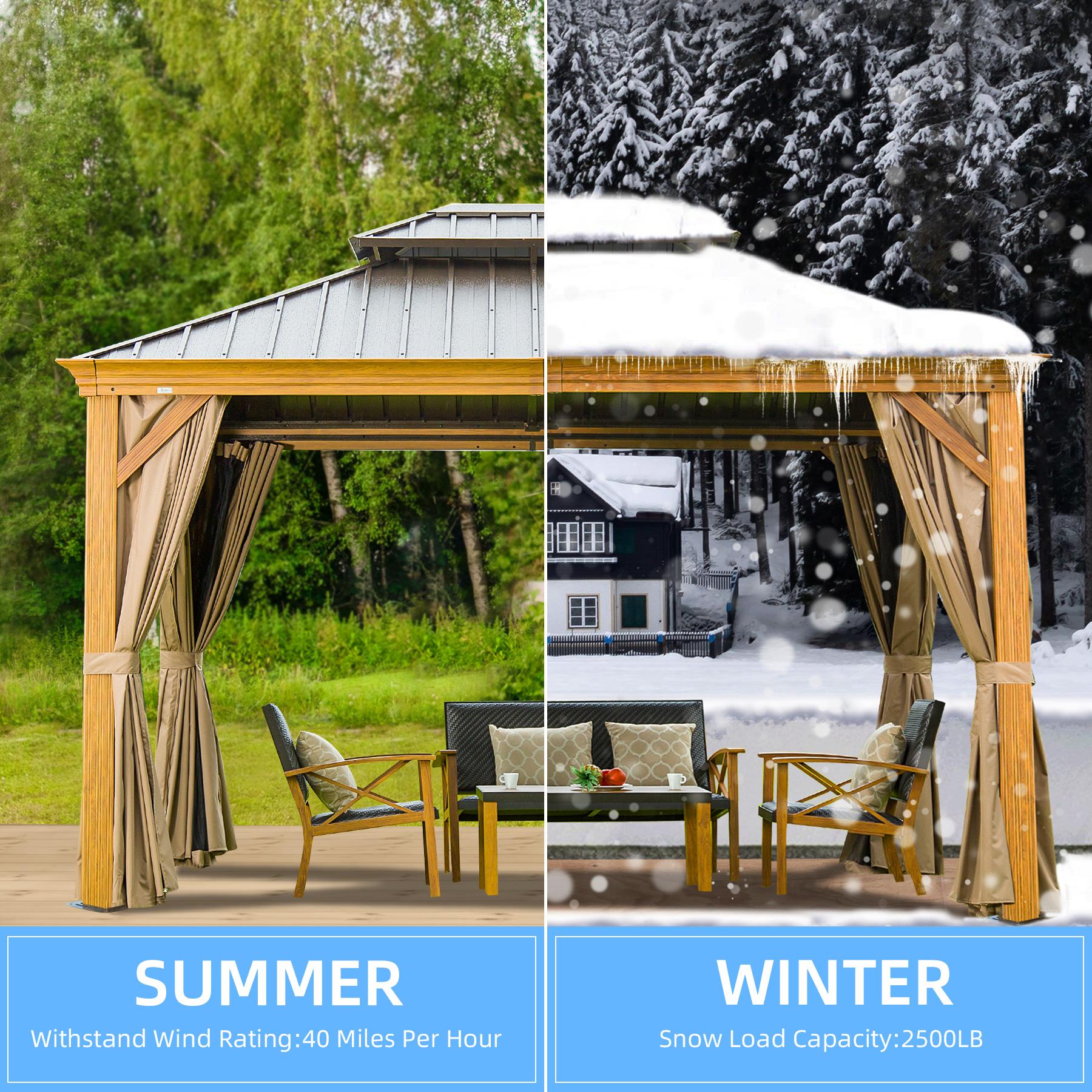 Galvanized steel hardtop roof is fade-resistant and rust-resistant, withstanding heavy snow in winter and providing stability in windy conditions. Double tops design offers a ventilated canopy withstanding high summer temperatures and UV rays. Wood-looking frame is achieved through thermal transfer printing, creating a natural ambience. Water gutter system allows for rainwater to drain away while curtains and netting provide UV ray protection and privacy. Packaged in 5 cartons with 5-year warranty on roof and 1-year on frame, curtains, and nettings. Brown gazebo also possesses galvanized steel hardtop roof, double tops design, sturdy aluminum frame, water gutter system, netting/curtains, and warranties. Package dimensions: 85*10*9 Inch (65lbs), 85*14*6 Inch (35lbs), 70*14*9 Inch (53lbs), 54*14*6 Inch (53lbs), 58*