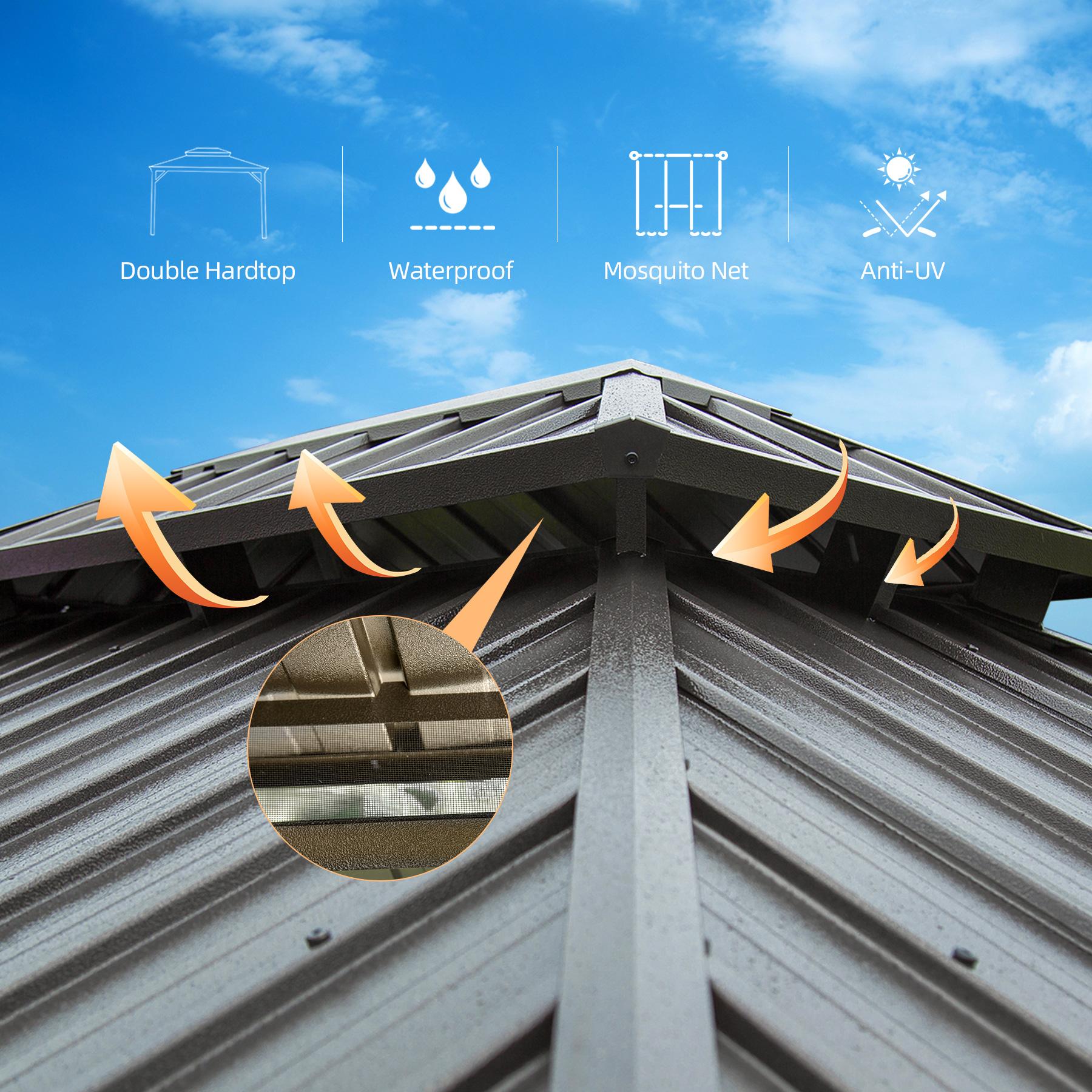 Galvanized steel metal top roof offers fade- and rust-resistance, able to bear heavy snow and sturdy in windy conditions. Ventilated double canopy design allows for air circulation. Wood-looking thermal transfer printing on the aluminum surface adds a natural atmosphere. Water gutter design channels water away from frame and poles. Includes removable curtains and netting for sun & privacy protection. 5 cartons with 5 year warranty on hardtop roof, 1 year warranty on frame and curtains/netting. Brown gazebo has triangular powder-coated aluminum stand pole with pre-drilled holes base. Package details: 85*10*9"/65 lbs, 85*14*6"/35 lbs, 70*14*9"/53 lbs, 54*14*6"/53 lbs, 58*29*4"/95 lbs, 105*17*8"/90 lbs, 85*14*10"/75 lbs, 93*114*10