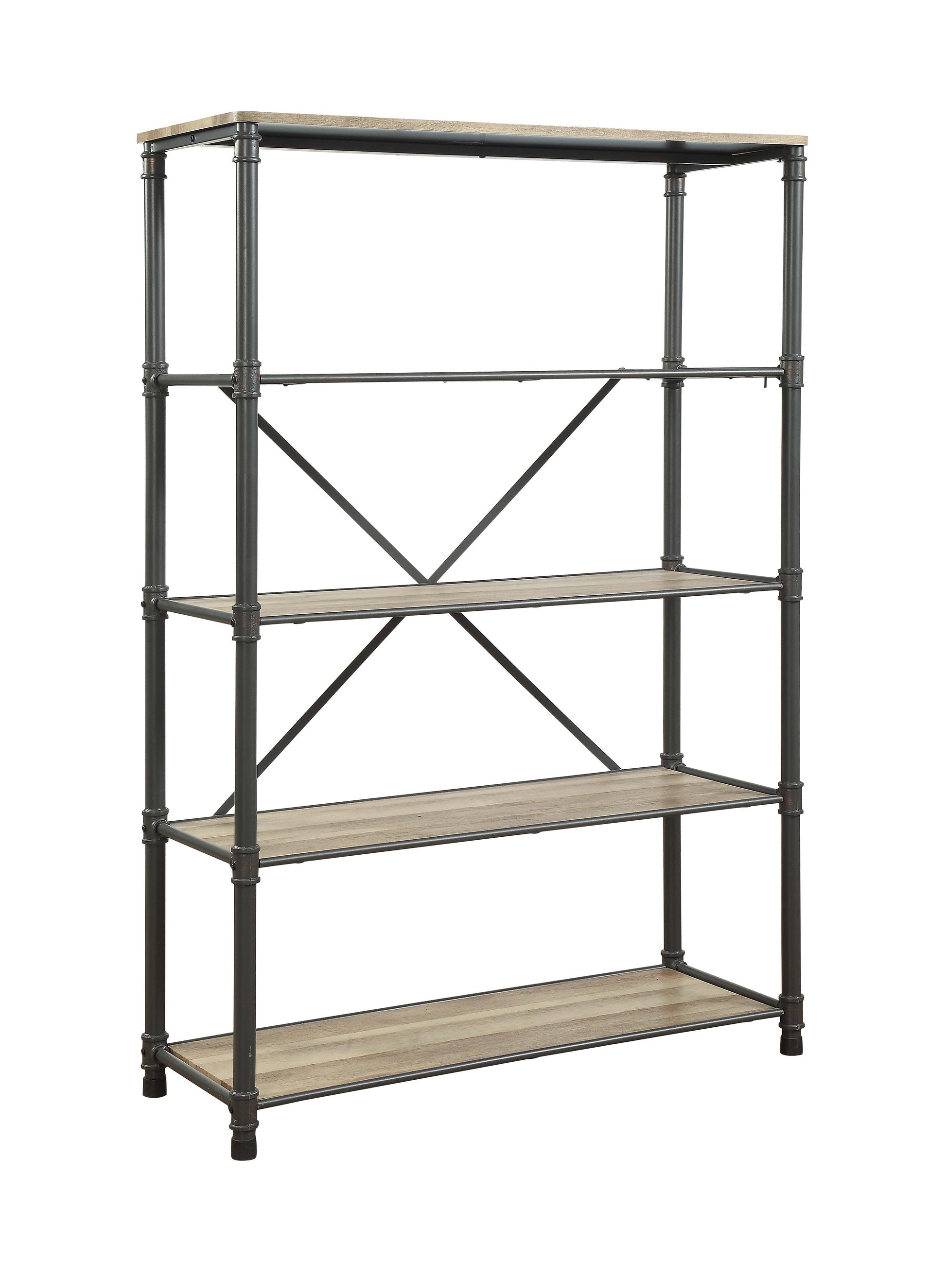 This elegant Itzel Bookcase offers an attractive classic antique oak and sandy gray finish to beautifully enhance any home decor. Its functional design features different contoured shelves and metal frame with powder coating and hand brushed industrial pipe castings. The rectangular bookcase provides 4 open compartments and 5 shelves with a storage capacity of 35 lbs per shelf. Some assembly is required. Dimensions: 49" x 20" x 71" H, shelf size: 44" x 17". Weight: 97 lbs. UPC: 0840412149504.