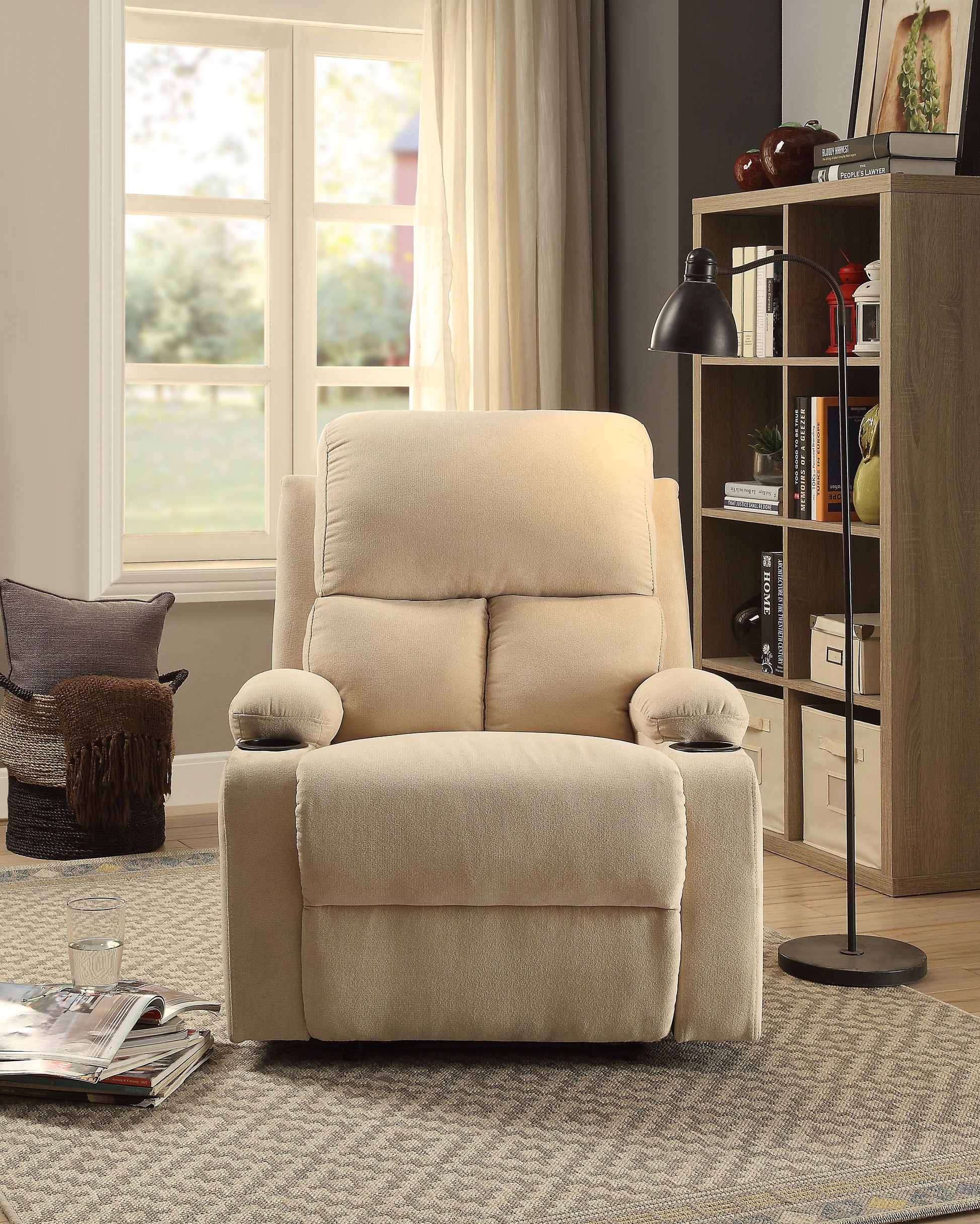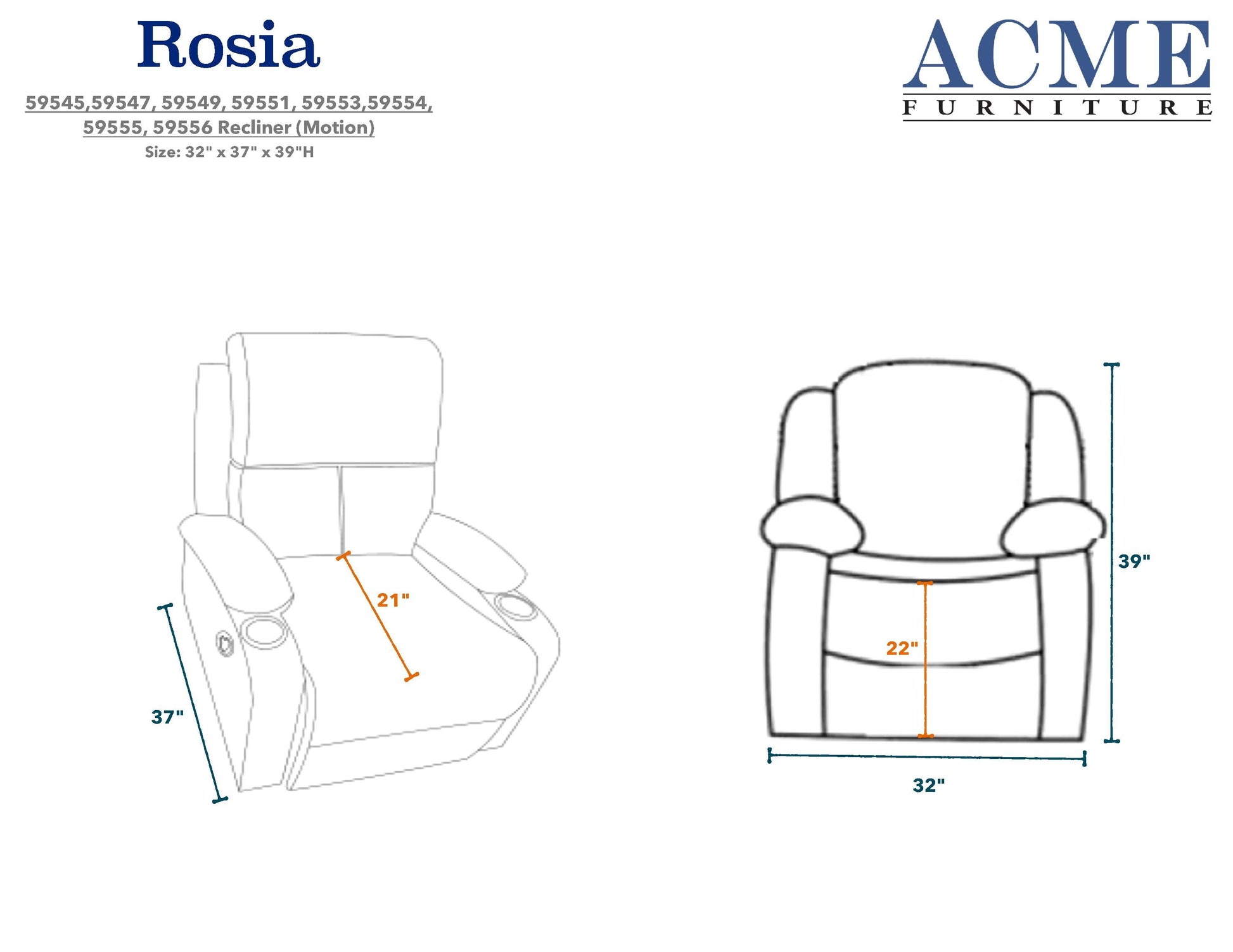 This Rosia recliner offers comfort, style, and value for any home. Its contemporary, casual design works in a variety of spaces, and upholstery in four different finishes lets you customize it to your taste. The reclining motion is activated with an external latch handle, and the high-density foam tight back and seat cushion, armrests, and cup holders provide plush seating. Manufactured in China, the dimensions are 32"L x 37"D x 39"H, and the seat size is 21"D x 22"H. Minor assembly is required, and the clearance from the wall is 5". UPC 0840412112591.