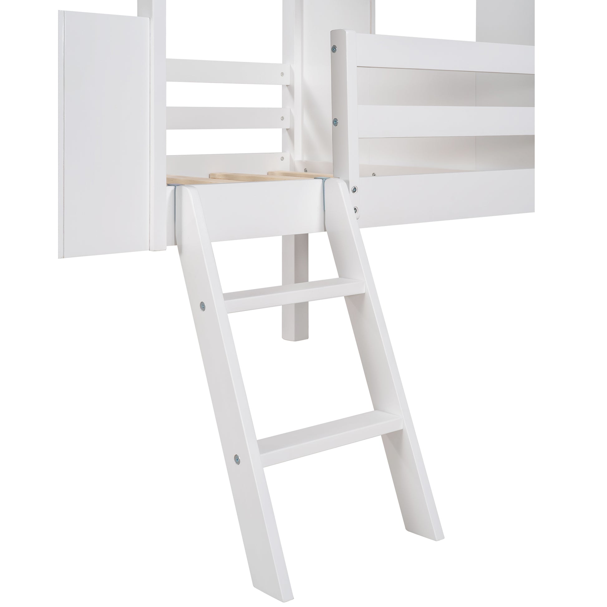 This Twin Size Low Loft Wood House Bed is designed for exploration and creativity. It features a roof and two side windows that double as a semi-enclosed play place, guardrail, and a sturdy pine frame for safety and comfort. It provides a cozy sleeping area with good air circulation. Plus, slats are included and no box springs or foundations are needed. Dimensions include: 80.6” L x 42.5” W x 76.5” H and a weight capacity of 275lbs. It comes with hardware, instructions, and a one-year warranty.